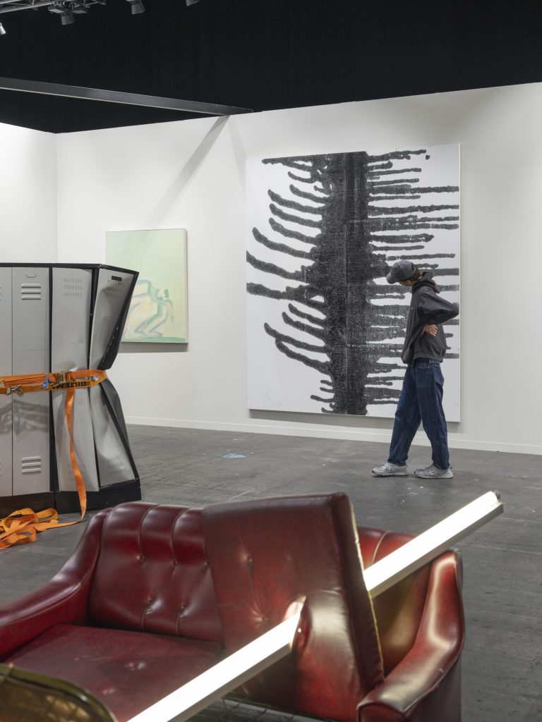 Crash brings together a selection of powerful works that resonate with the turbulence of our times. Albert Oehlen’s stormy landscape opens the space, where abstraction and figuration intertwine to depict various states of dismantlement and disintegration. Sarah Lucas’ exploded sofa, Matias Faldbakken’s crushed locker, and Wade Guyton’s unfolded chair are brutal assaults on the banality of everyday life. Sergej Jensen’s expansive spillage evokes the chaotic energy of Christopher Wool’s Rorschach-inspired silkscreen, whose dripping limbs connect to Bruce Nauman’s severed heads, Maria Lassnig’s headless body, and Robert Gober’s detached arm. These works invoke art’s ancient apotropaic function, conjuring dark forces to keep them at bay. Their power lies not only in their dark humor but also in our morbid fascination with disaster—we simply can’t look away.